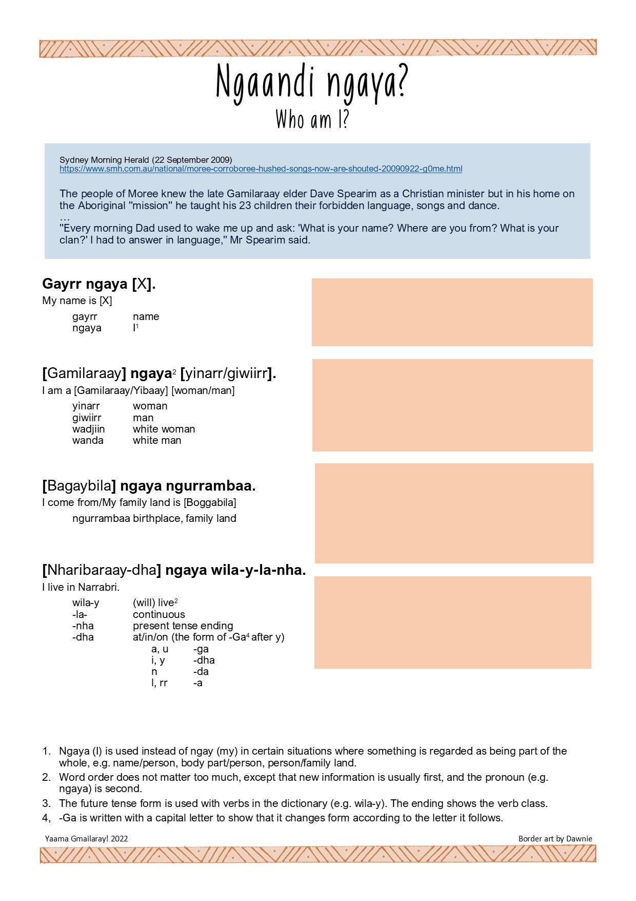 For the main body of the welcome or acknowledgement, here are some Gamilaraay options to mix and match according to the situation: