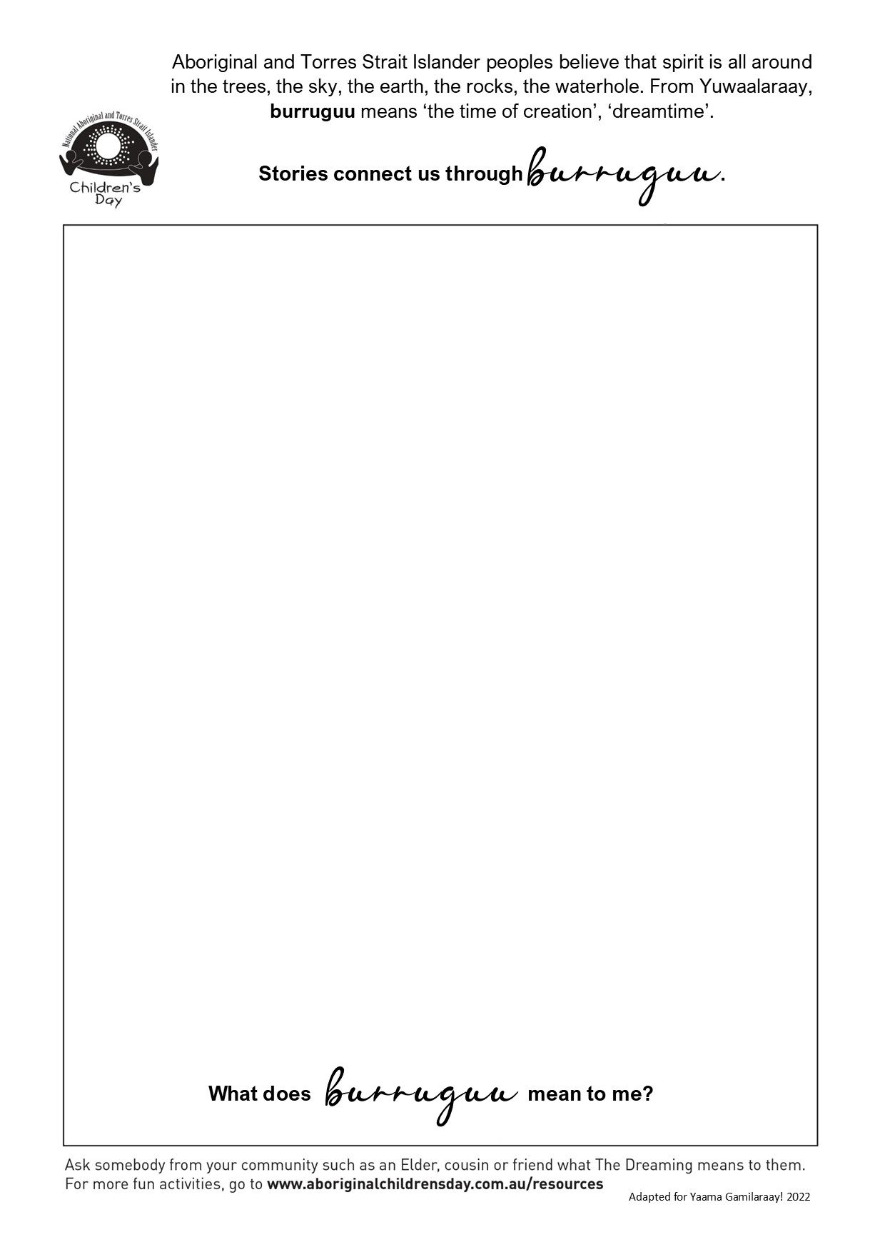 The 2022 theme is ‘My Dreaming, My Future’. Our translation uses burruguu, the YR word for "time of creation,