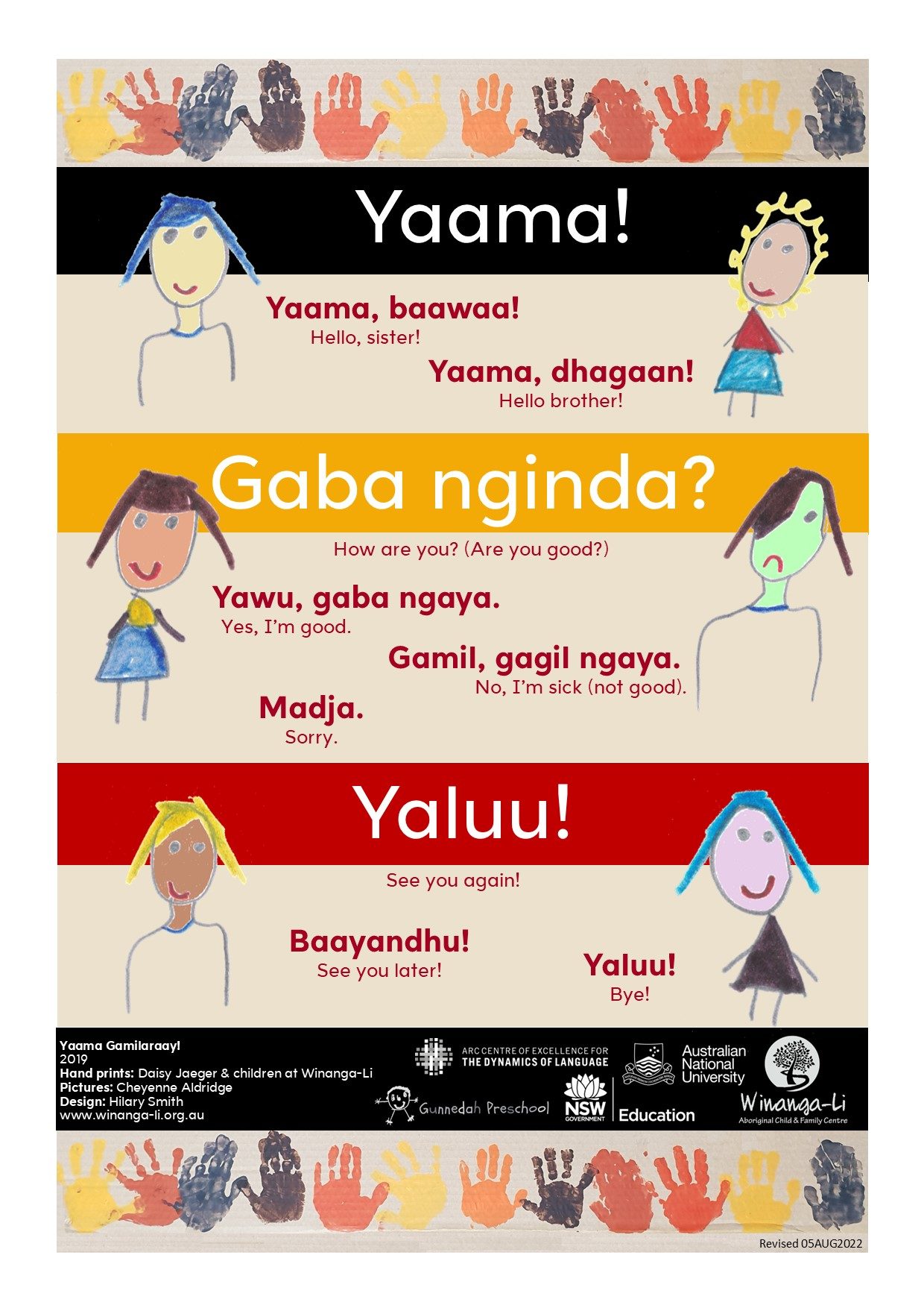 Our greetings poster has pictures by Gamilaraay student Cheyenne Aldridge and handprints from Winanga-Li Early Learning