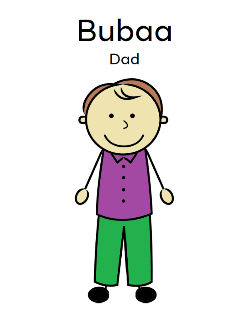 Set of seven small flashcards of family members for children to colour in, cut out, laminate, etc.