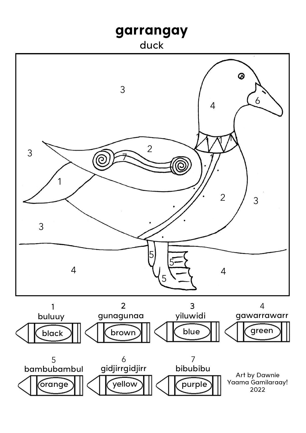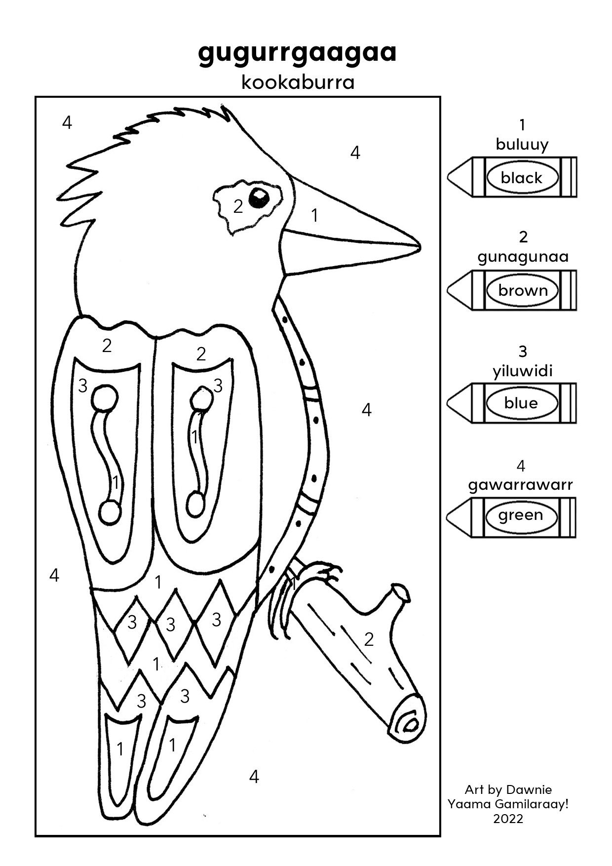 We have colour-by-number sheets from designs by Gamilaraay artist Sharon (Dawnie) Wortley: