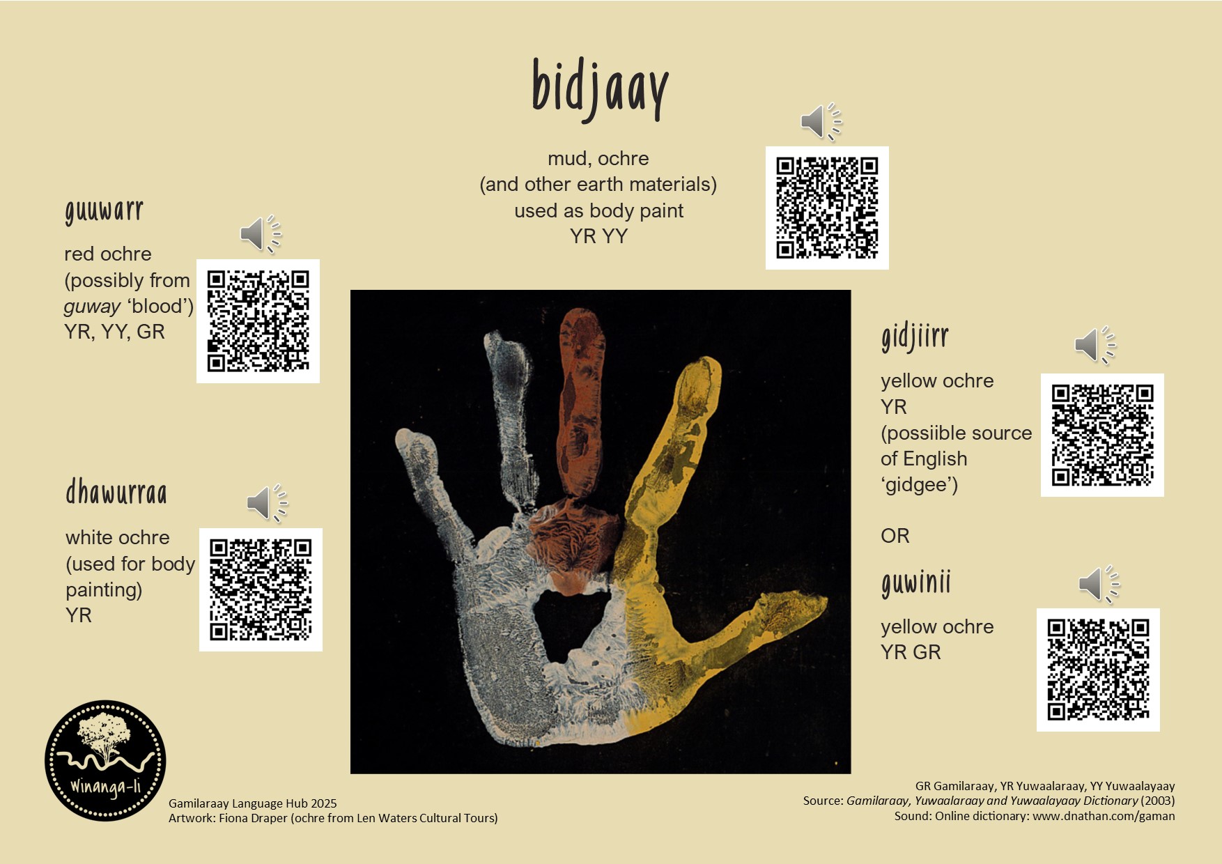 Download a set of 10 A4 posters with artwork by Sharon (Dawnie) Wortley, with cultural and linguistic background information where appropriate (red and black are shown): Colours-posters_20APRIL21.pdf
