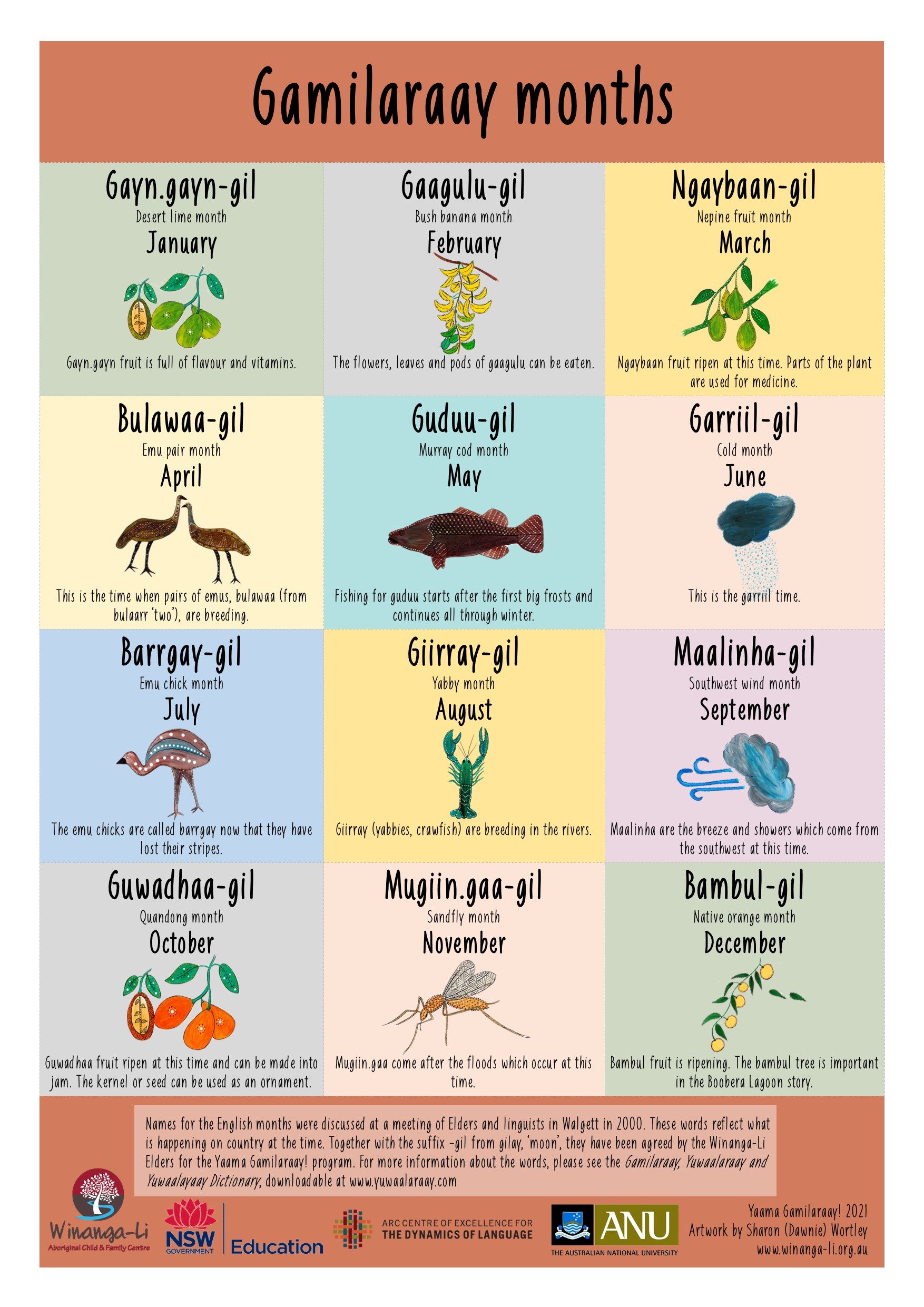 Words for the months were suggested in June 2000 at a meeting in Walgett of Uncle Ted Fields, John Giacon, John Brown and Tracy Dodd. Suggestions were made from what the Elders knew was happening on country at the times. These words were trialled after further discussions at in 2019 at Winanga-Li;; the suffix -gil from gilay ‘moon’ was used for each month, and for the word 'month' gilay ‘moon’ with maal ‘one’ to make gilaymaal.