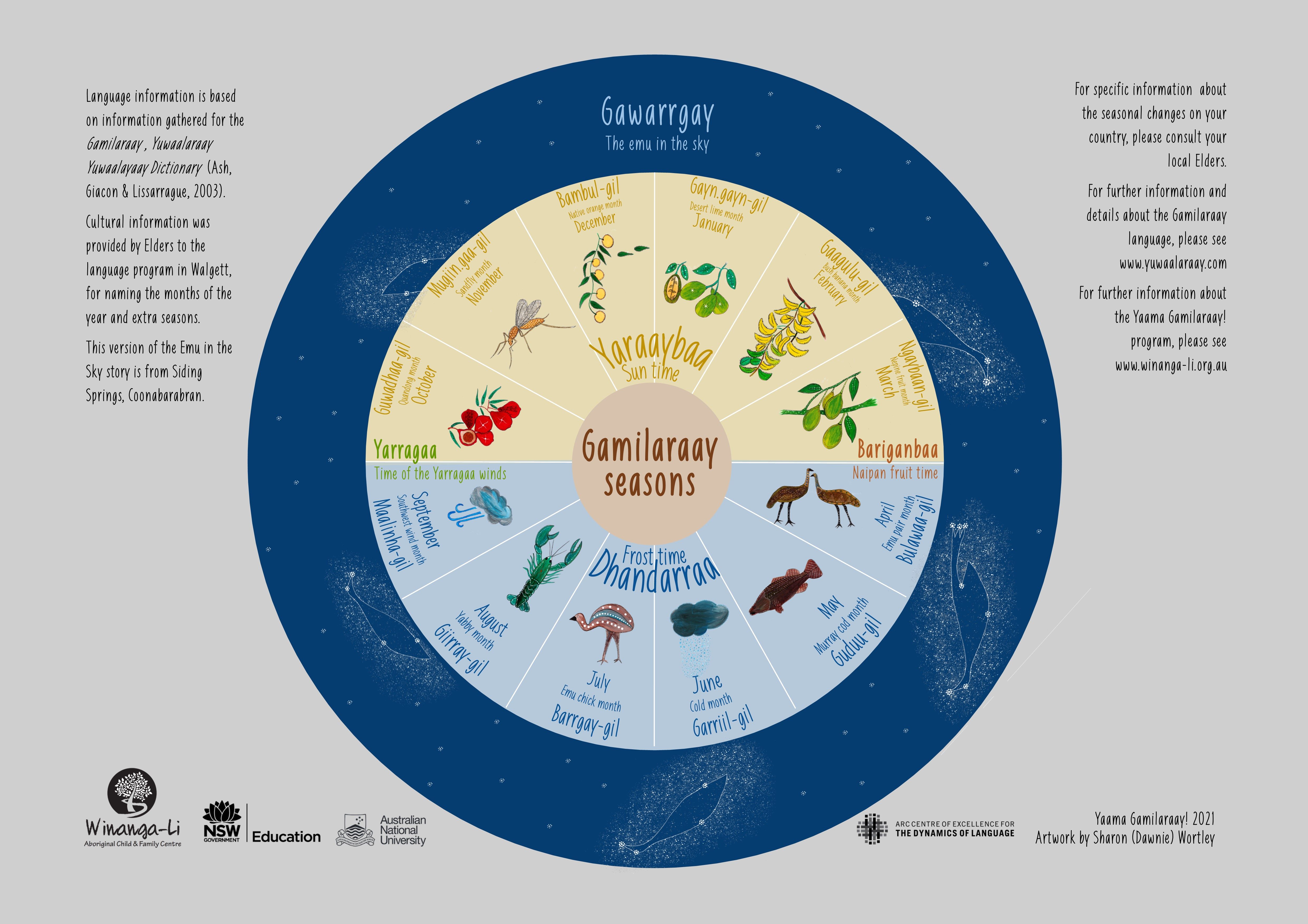 Traditional Gamilaraay life was organised around seasons rather than twelve months, and there were no words for the months of the year.