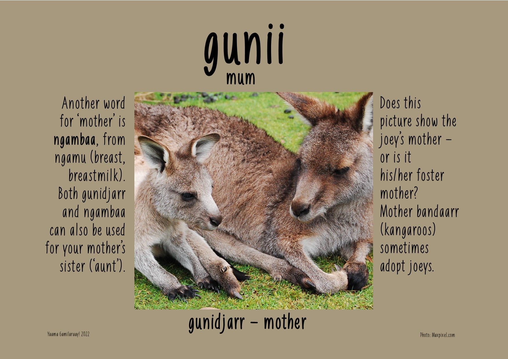 It’s quite important to try and pronounce the ‘rr’ at the end of the word gunidjarr, because there is another word gunidjaa which means ‘orphan’ – this is probably from gunidjarr-dhalibaa, ‘mother-without’ (the double 'aa' in this case means the stress is on the second syllable). People who find it difficult to say the rolled ‘rr’ might find it useful to start by saying ‘d’ softly.